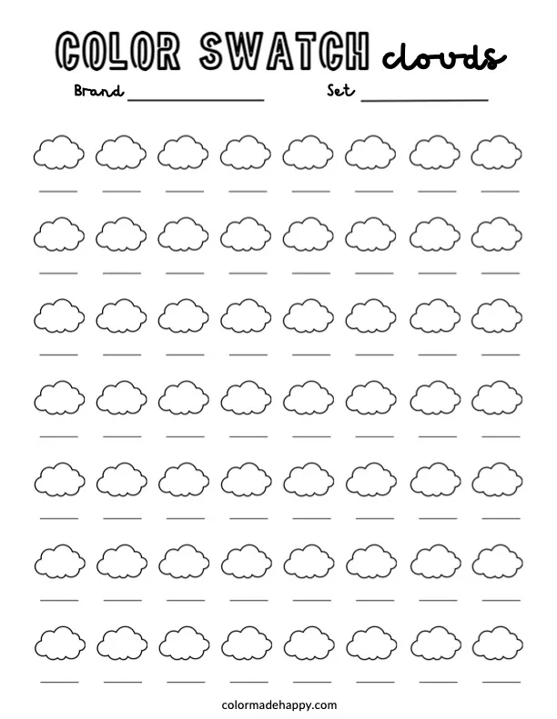 This cloud swatch chart lets you float your favorite colors across the page. Use this printable swatch chart for a dreamy and creative way to test your art supplies.Â