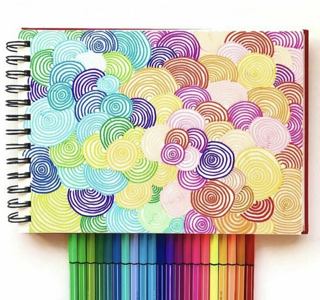 For this doodle I just drew small circles using vibrant colors. I kept the circles together in curved rows to give the appearance of a rainbow at the end.easy pattern idea with circle
