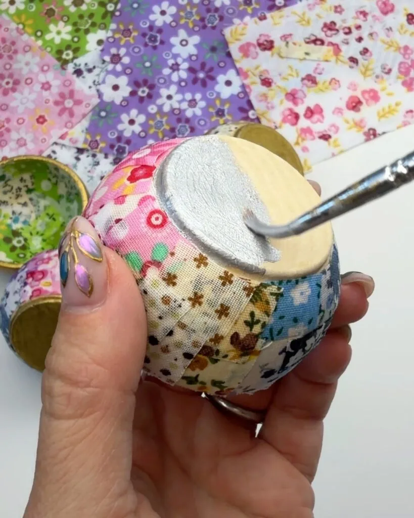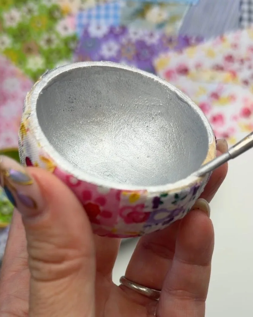 If you covered the outside, paint the inside of the bowl with gold or silver metallic paint or vice versa. The contrast looks so pretty, and the shimmer makes the fabric pop. I also like to paint the bottom of the bowl as well.