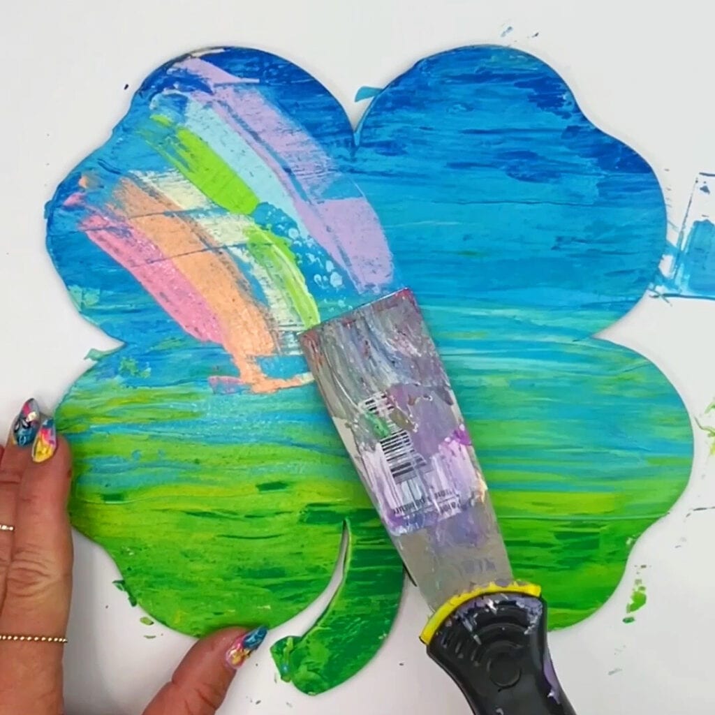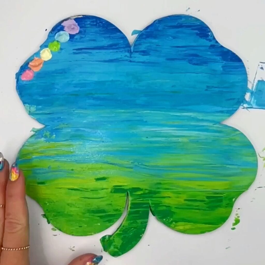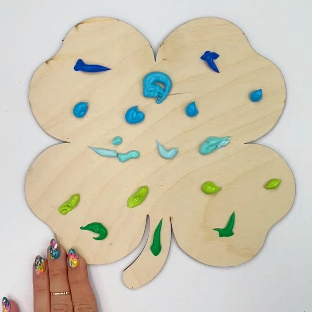 - Start with paint directly on the wood shamrock for the background. I used green and blue acrylic paint.Â