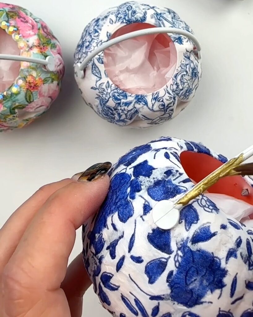 Step 7. Once the entire pumpkin is covered you can add details like a painted gold handle, ribbon or rhinestone details.