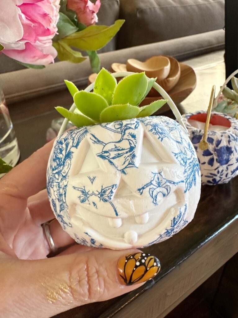 I came across some mini Jack O’ Lantern candy buckets and just knew I had to figure out a fun way to craft with them. Using my favorite crafting technique, I decoupaged some pretty napkins onto them and turned them into adorable little decoupage jack o’ lantern buckets that could hold candy, succulents and more.
