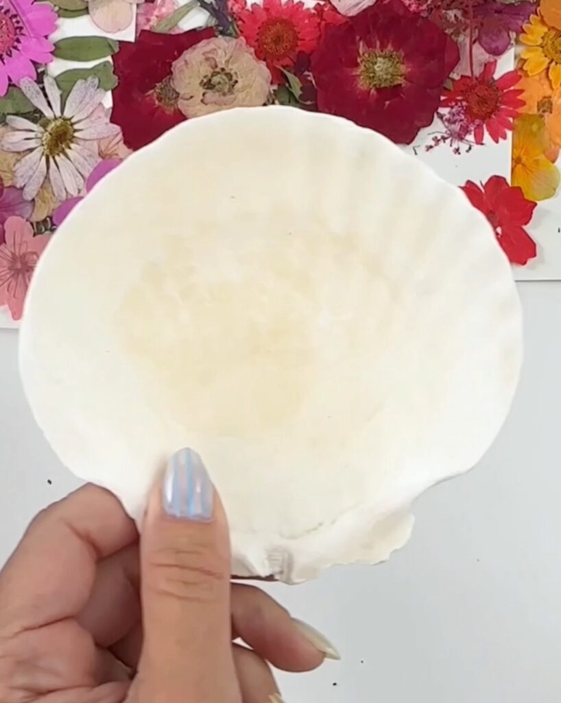 If you’ve seen some of my crafts on Instagram you know that I love working with pressed flowers. My secret is that I buy my pressed flowers to make it even easier. Some of my favorite pressed flower crafts are these trinket dishes, pressed flower jars, dried flower bookmarks and pressed flower pumpkins. For this resin shell craft, I combined two of my favorite natural elements, pressed flowers and seashells, to create something truly unique and beautiful.