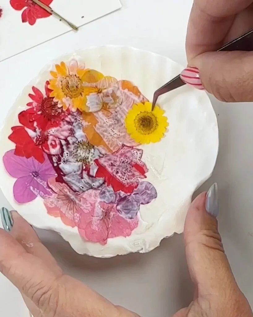 Spread out your pressed flowers to visualize your palette and placement. Plan how they’ll lie across the shell’s curved interior.