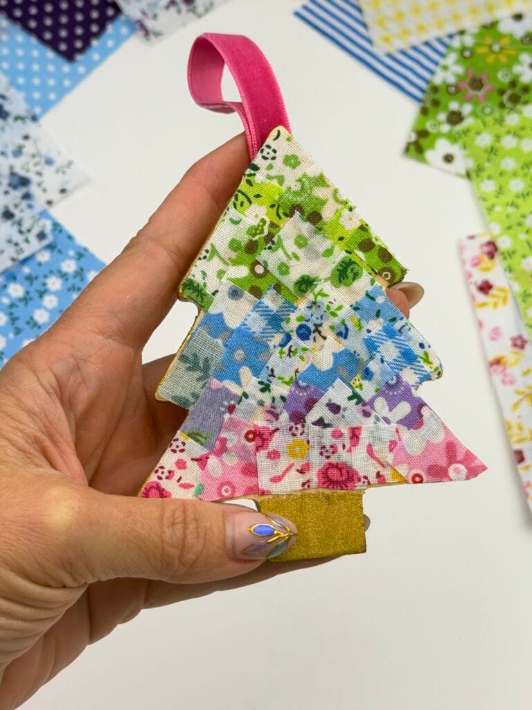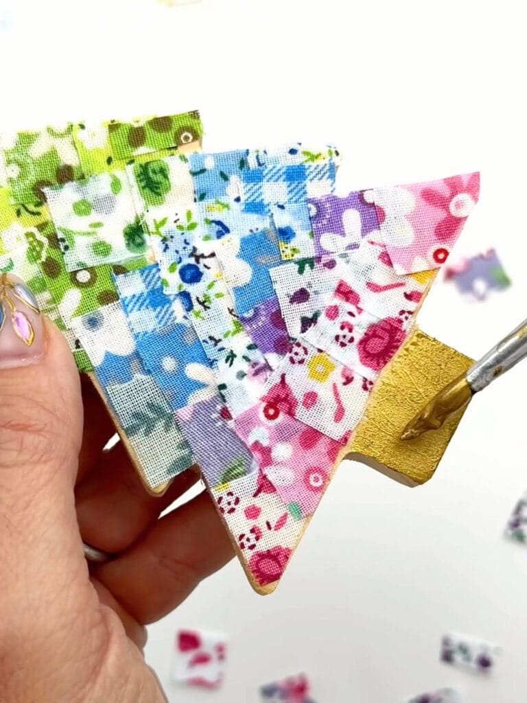 Decoupaging fabric onto wooden Christmas ornaments is an easy and fun holiday craft that turns out beautiful every time. It’s also a great way to use up leftover fabric scraps, and if you don’t have any on hand, I linked some options for you under the supply list. These custom fabric decoupage ornaments make beautiful gifts, look gorgeous on the tree, and are perfect for anyone who loves simple, colorful DIY projects. For another fabric craft idea, check out my tutorial for fabric-covered mini wooden bowls.