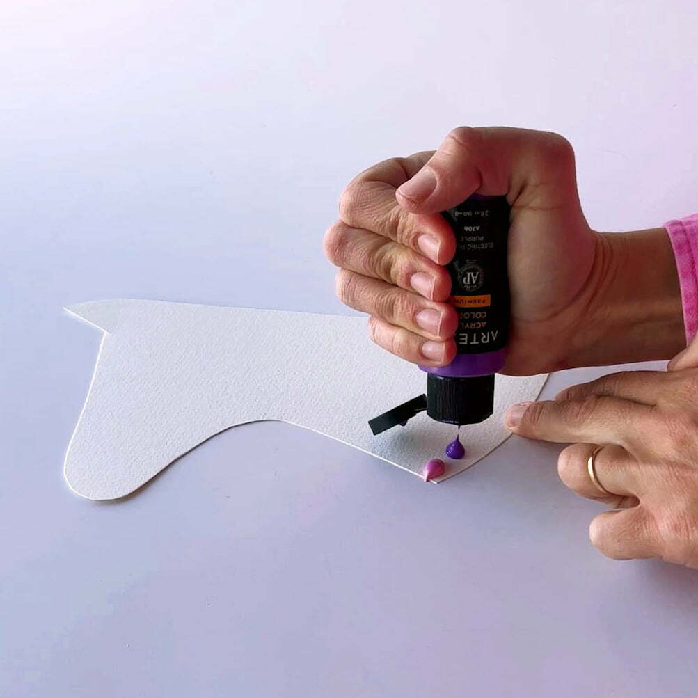 Step 2: Squeeze a little bit of pink, purple, and blue acrylic paint onto the bottom left edge. You can also create a rainbow unicorn or use any colors you like.