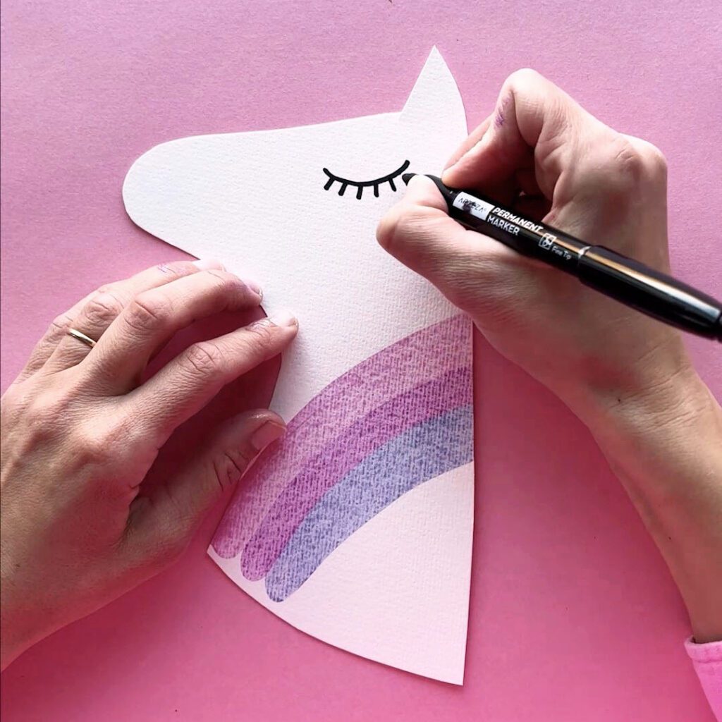 Step 6: For the unicorn’s nose, color in a little circle. You can also use a paper puncher to cut out a little circle and paint it and glue it down.Â