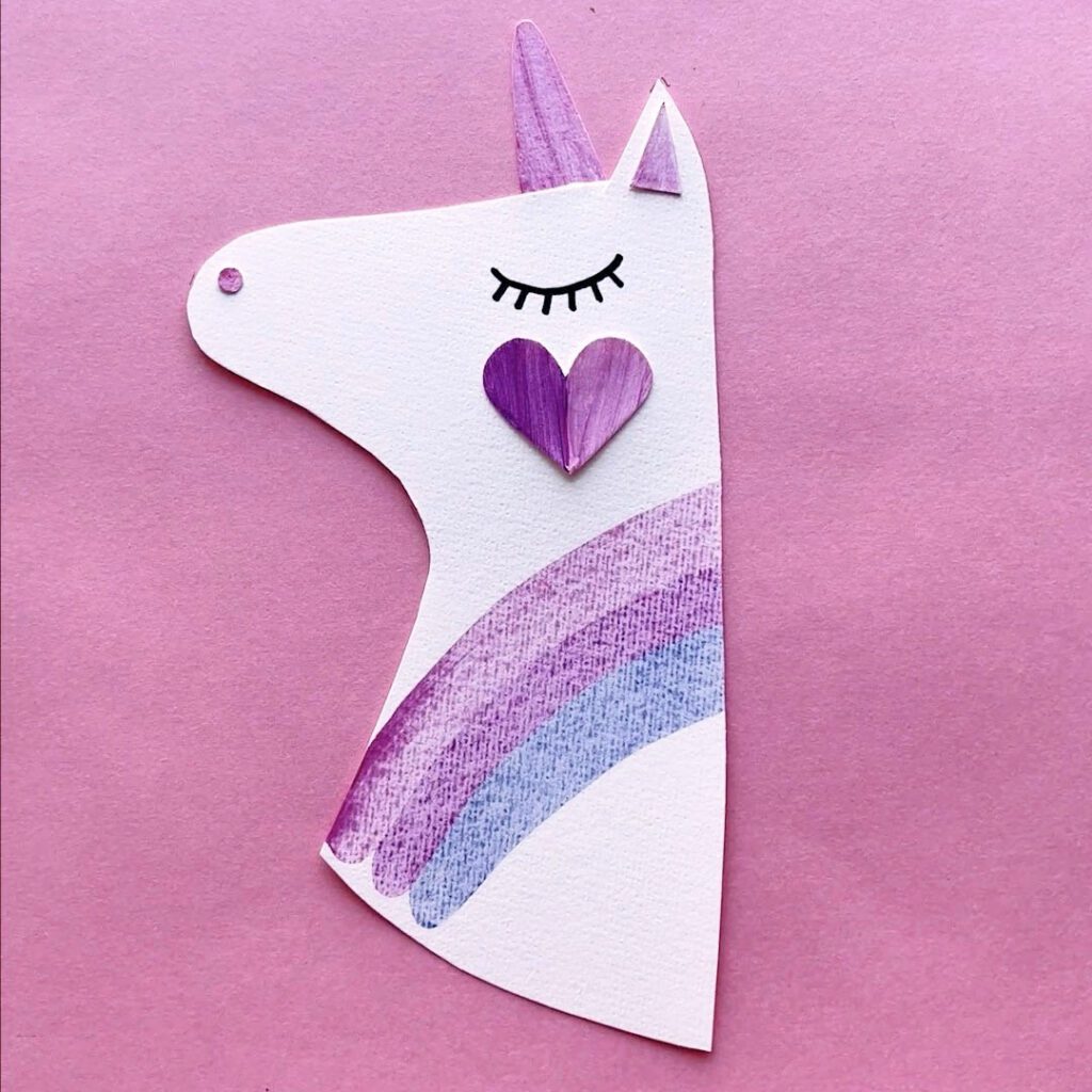 Step 5: Draw a heart shape underneath the eye. One side of the heart can be pink and the other side can be purple. You can always cut out a little heart shape, paint it and once the paint is dry, simply glue it underneath the eye. This will be the unicorn’s cheek.
