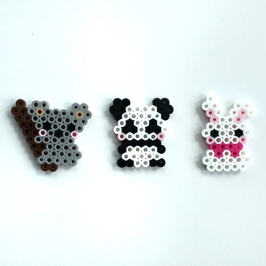 The koala, panda and bunny perler bead designs below are all made using a hexagon pegboard.