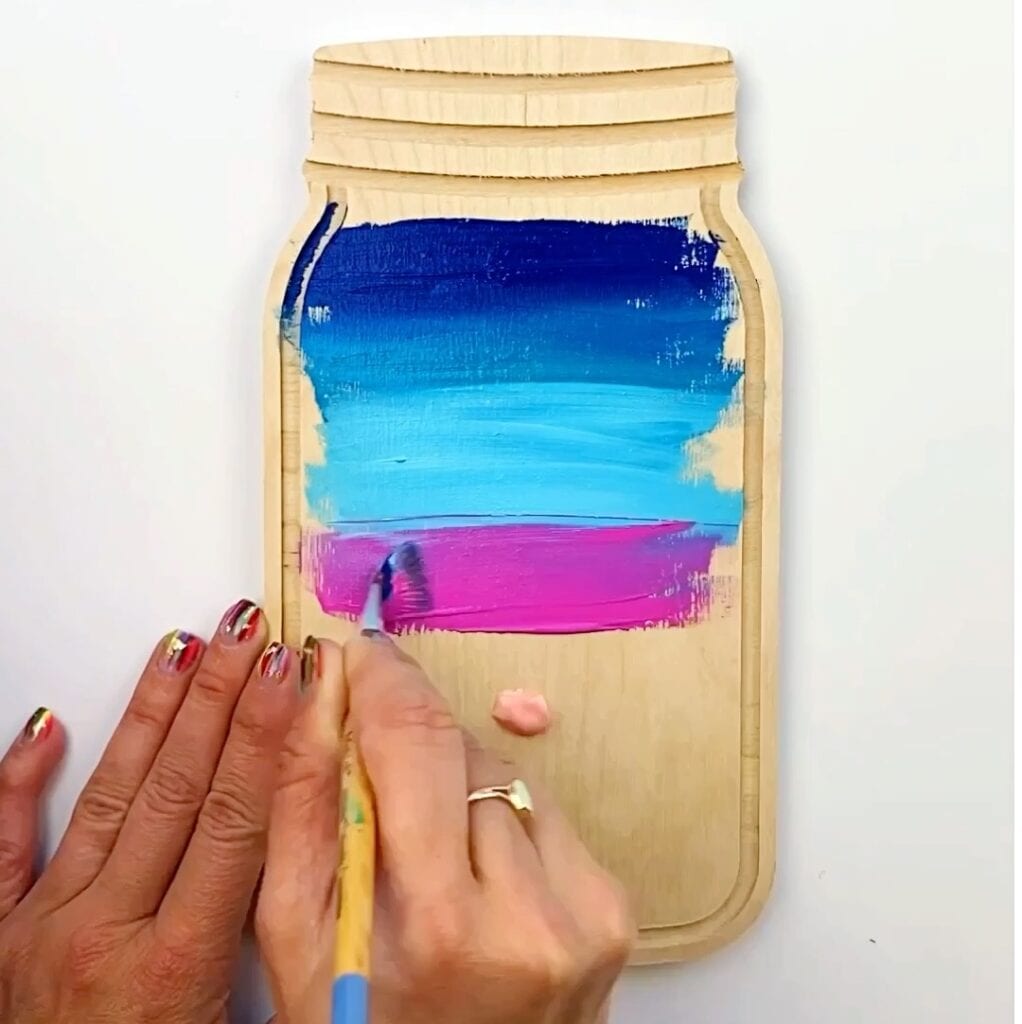 - Start by painting the background. I like to apply the paint directly to the wood slice and then use a flat flash to blend the paint colors. I typically blend two colors at a time, cleaning my brush between sections. I don’t mind the colors overlapping and streaking into one another and I find that a drier brush helps with adding dimension. Don’t worry about the blending being perfect.