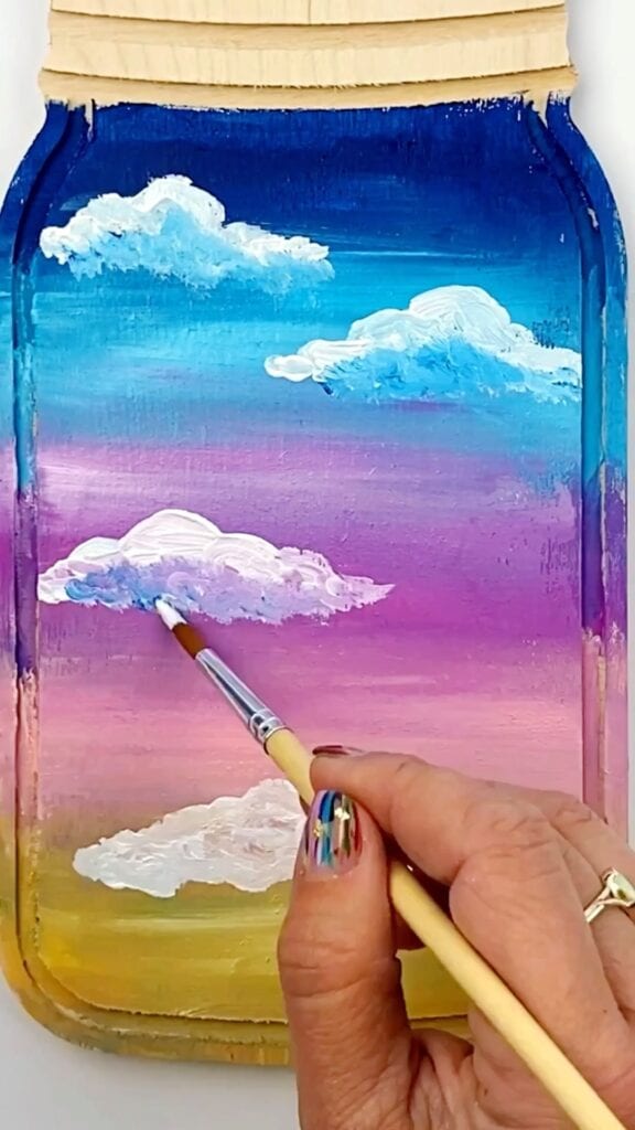 - At the bottom of each cloud add a bit of color. For the clouds in the blue background add blue and add blue and pink in the middle and lower clouds. Â Â Â