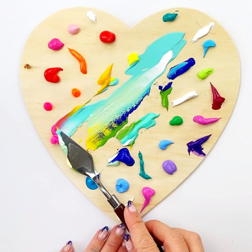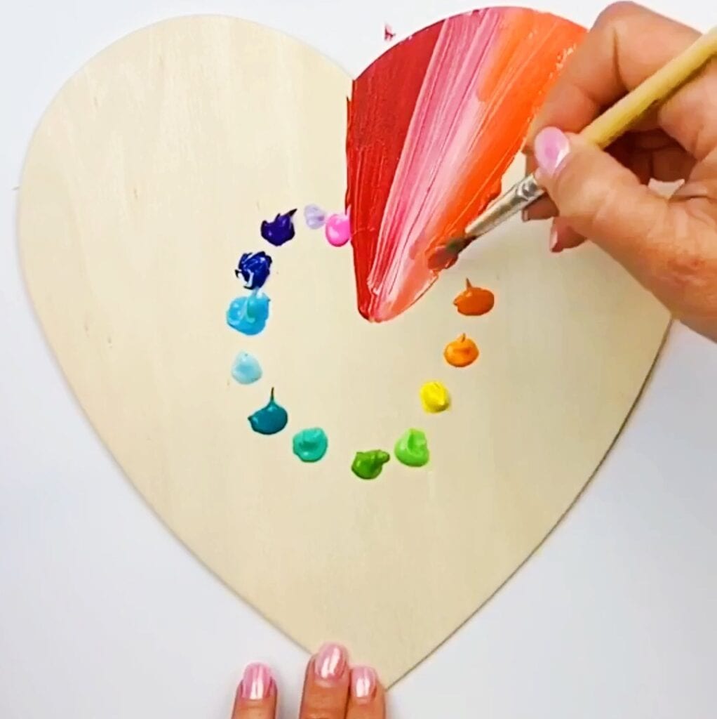 - I started with the acrylic paint in rainbow colors across the entire top of this painted heart. I used this wooden heart. This is another great wooden heart option.