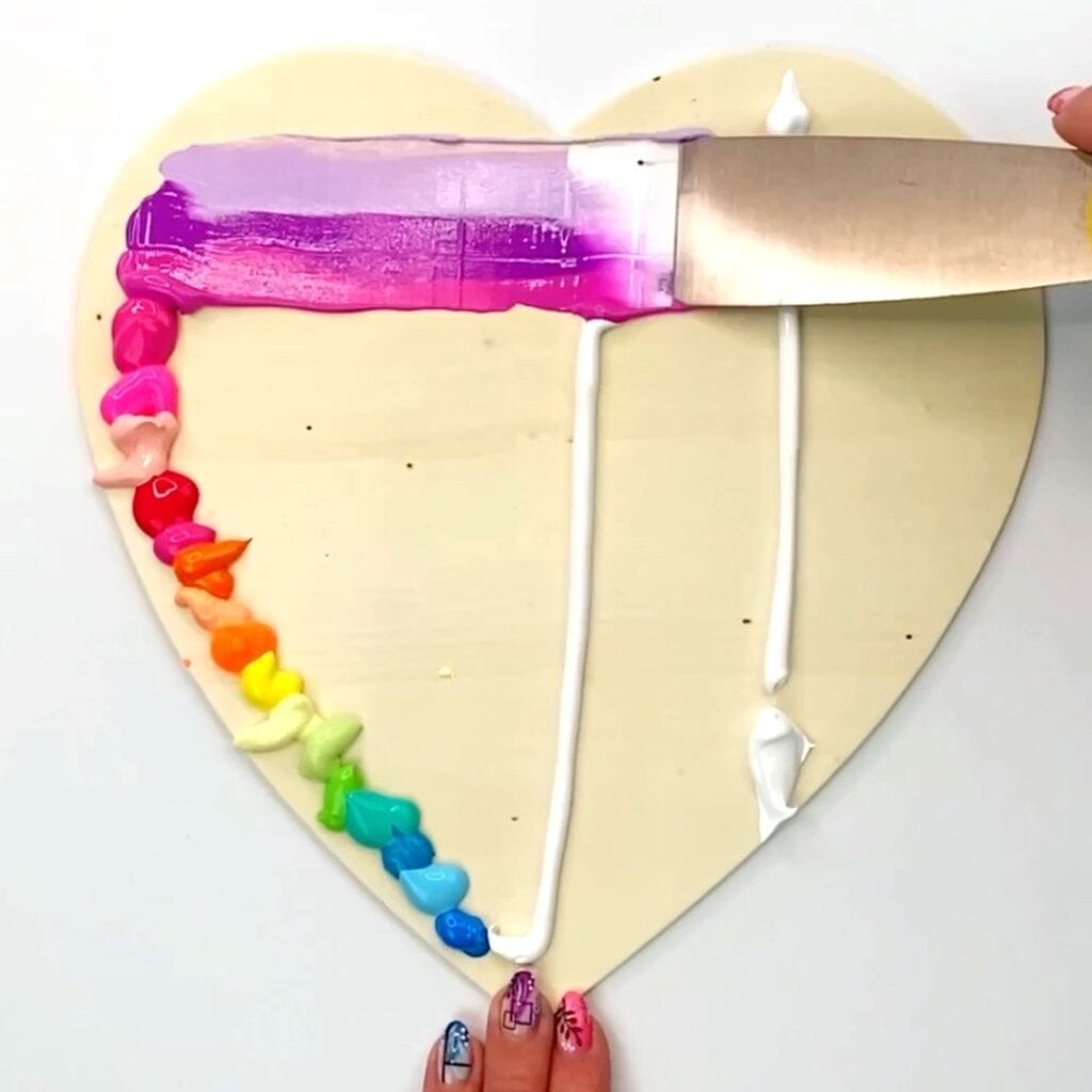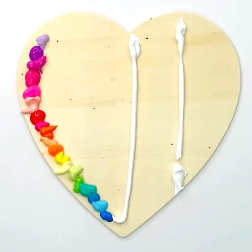 - For this technique I started with acrylic paint directly on the heart. I put a variety of rainbow colors along the left side of the heart and then used white paint lines poured directly from the paint tube on the right.Â