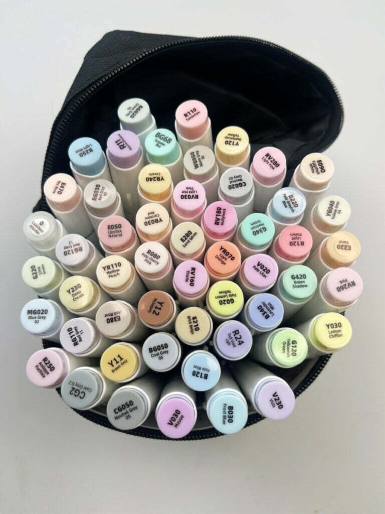 - Alcohol markers – For this coloring page I used pastel Ohuhu alcohol brush markers. These alcohol brush markers also come in a regular colors set that would be a great option as well.