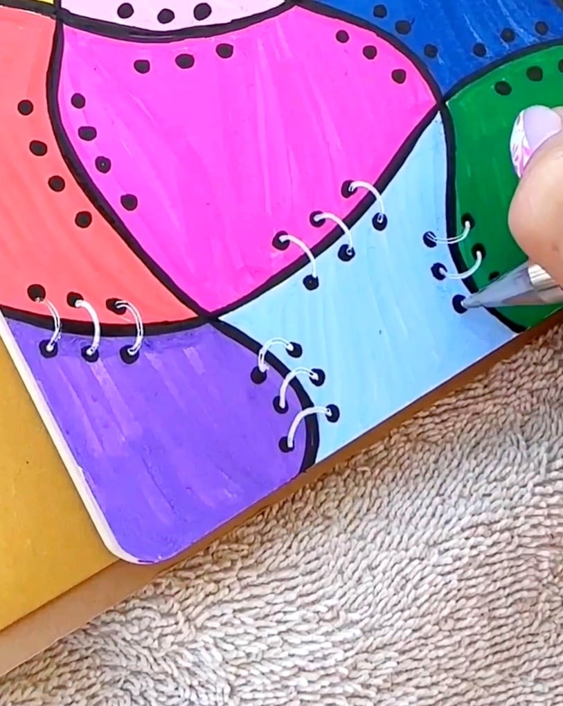 Step 6. Finally take a white gel pen and draw a circle curve connecting the dots that are above and below each line. This will create a sewn pattern look.