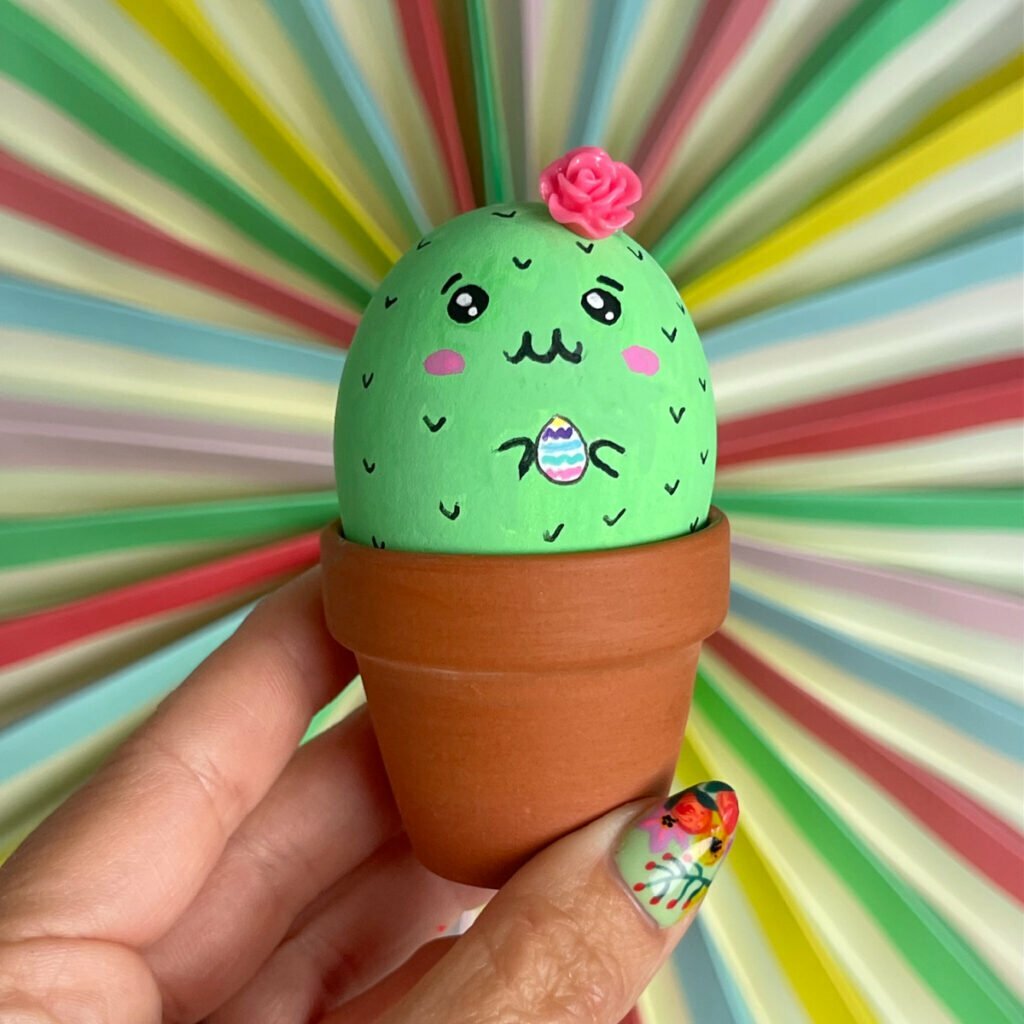 Now that you have an adorable cactus easter egg to enjoy you can have fun with more cactus designs. Try out different facial expression, accessories and embellishments. You could also paint the flower pot with a fun and colorful design. There are so many fun ways to create your own unique cactus egg design.