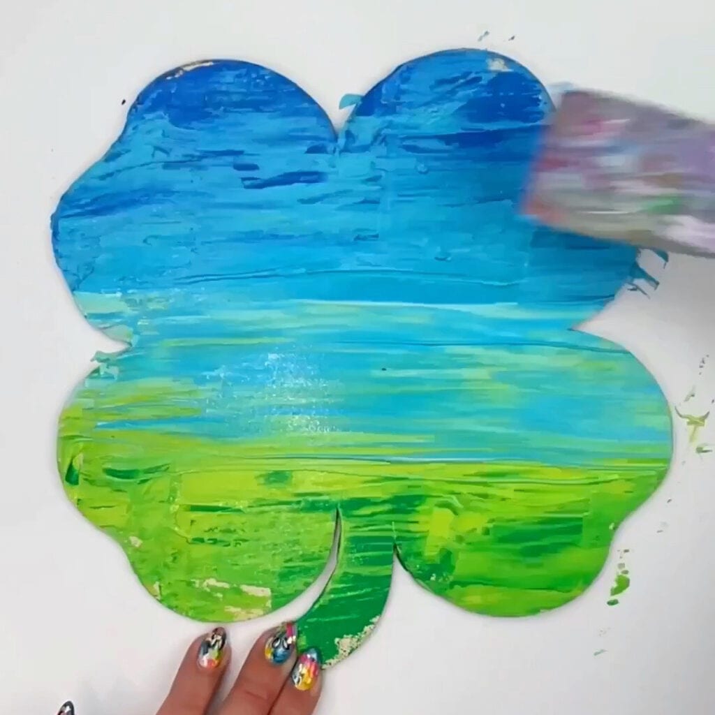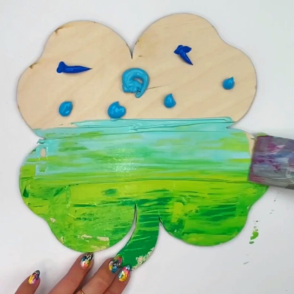 - Start with paint directly on the wood shamrock for the background. I used green and blue acrylic paint.Â
