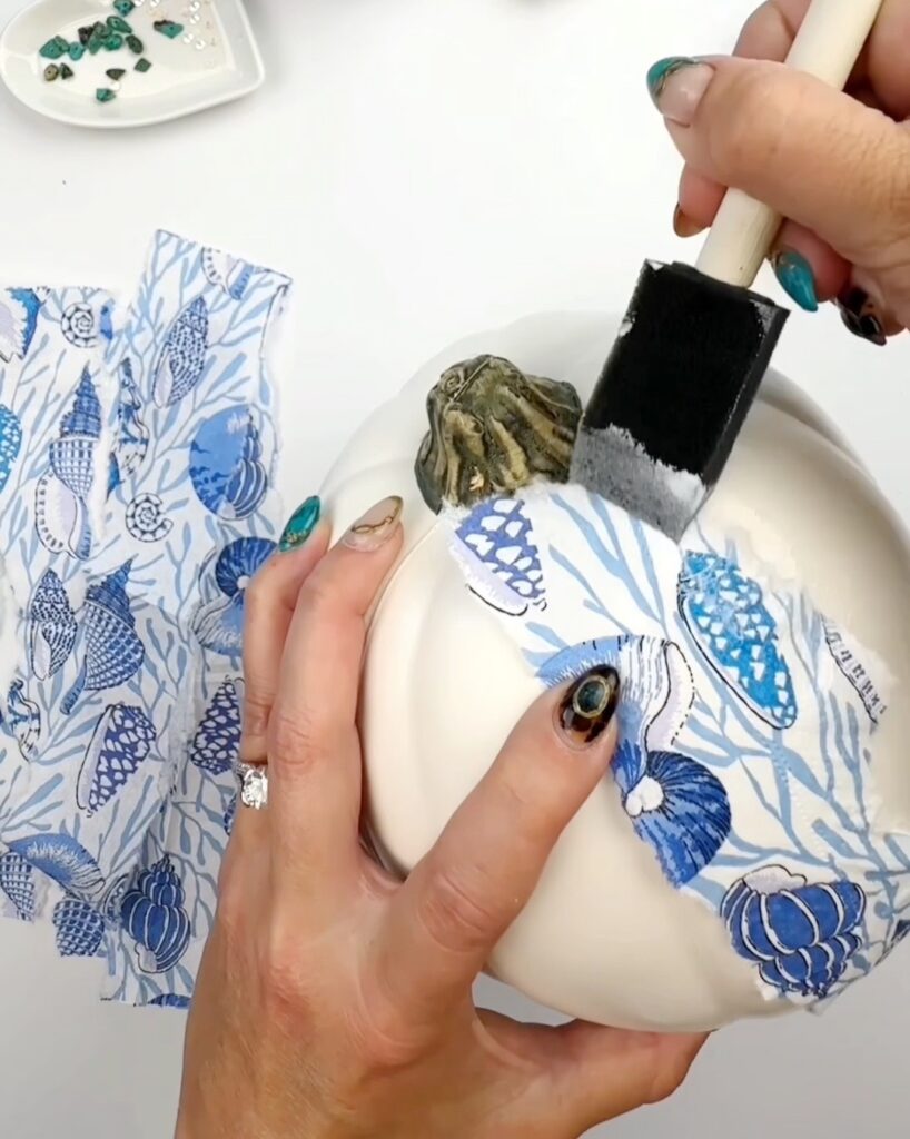 Step 5. Continue to add Mod Podge and napkin pieces as you work your way around the pumpkin. I didn’t line up all of the pattern images but I did line up a few to make it look like a seamless pattern. If you are working with just large images that you cut from the napkin you can just add them all individually around the pumpkin.