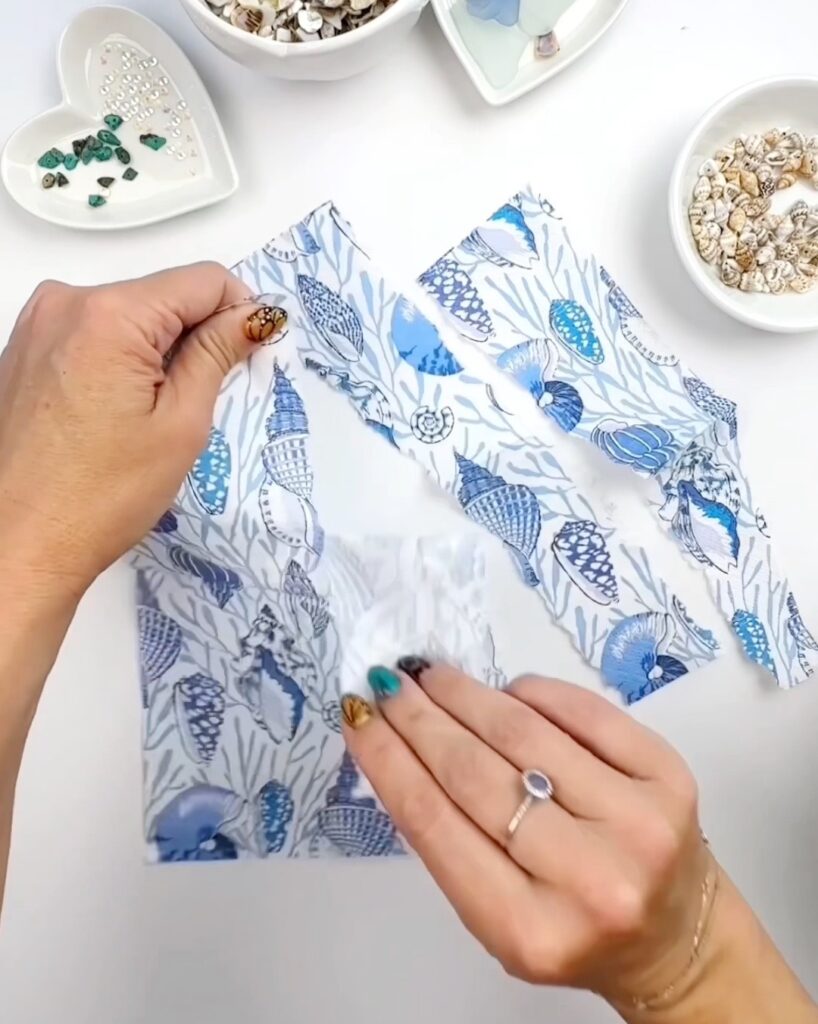 Step 2. Next tear your napkin in to long pieces that aren’t too thick. When working with patterns I prefer to keep my piece long instead of tearing a lot of small pieces that make it difficult to see the pattern. If you have a napkin that has large images instead of a pattern you can individually cut out the images.